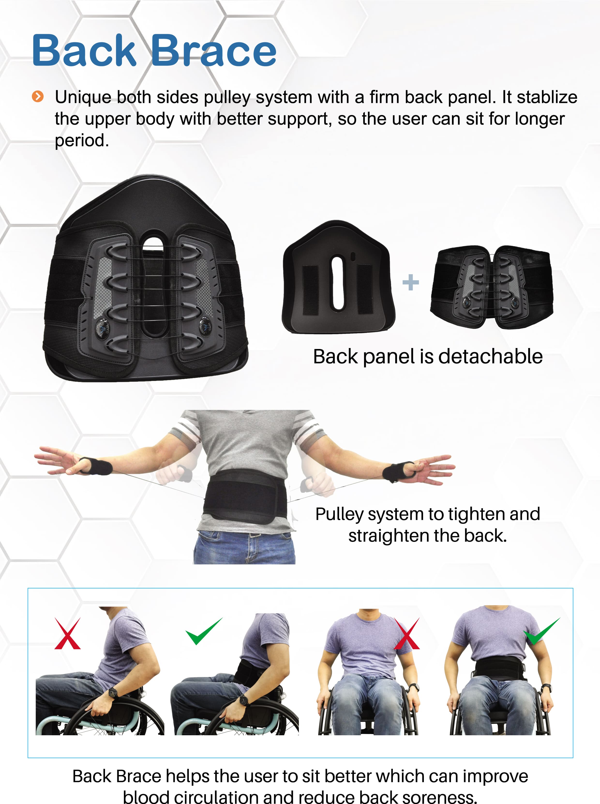 - 能幫助使用者固定腰部,不會因腰部力量不足在使用輪椅時左右或前後傾斜