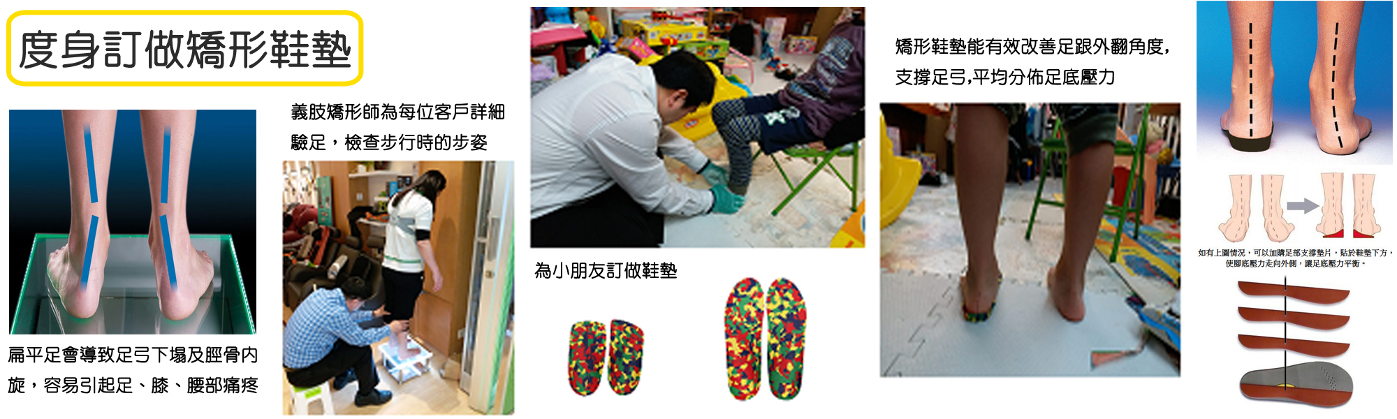 扁平足會導致足弓下塌及脛骨內旋,容易引起足、膝、腰部痛疼,而我們的專業義肢矯形師為每位客戶詳細驗足,檢查步行時的步姿,為小朋友訂做矯形鞋墊,經義肢矯形師矯形訂製的鞋墊能有效改善足跟外翻角度、支撐足弓、平均分佈足底壓力