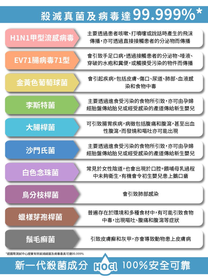 殺菌消毒 – 有效殺滅常見細菌、病毒、真菌及芽孢菌達99.999%